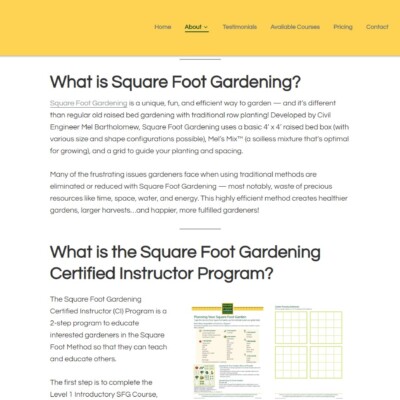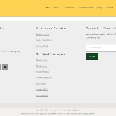 We developed a robust FAQ section, changelog and integrated a ticketing system using the FAST support plugin which integrates with WooCommerce. The focus was on signing prospective student up to take the Square Foot Gardening Courses.